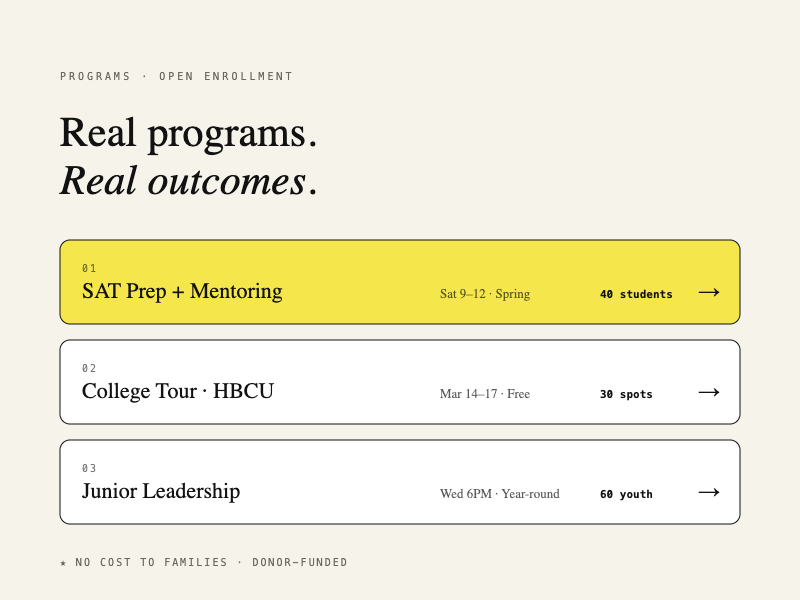 A 27-year-old mentorship organization with real, measurable community impact was running on a dated, hard-to-navigate website. Young men trying to enroll in the S.M.A.R.T. Academy and prospective members looking to contribute couldn't easily find what they needed. The digital presence didn't reflect the weight of the mission.