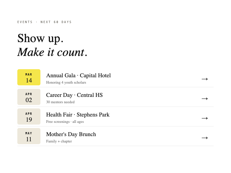 A redesigned chapter website with two clear action paths — enroll in S.M.A.R.T. Academy, or join as a member. The information architecture surfaces the impact data that earns trust (500+ young men mentored, 10,000+ volunteer hours) and routes visitors to the right program without friction. Built to WCAG 2.1 AA accessibility standards.