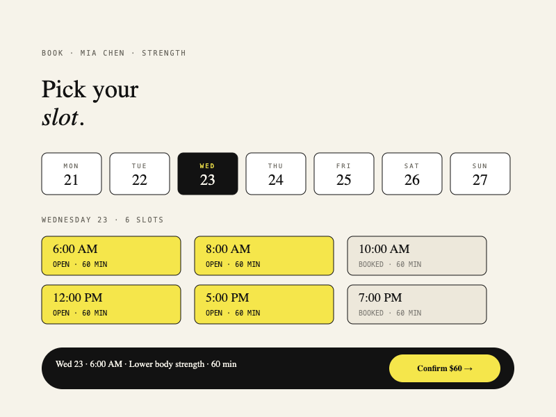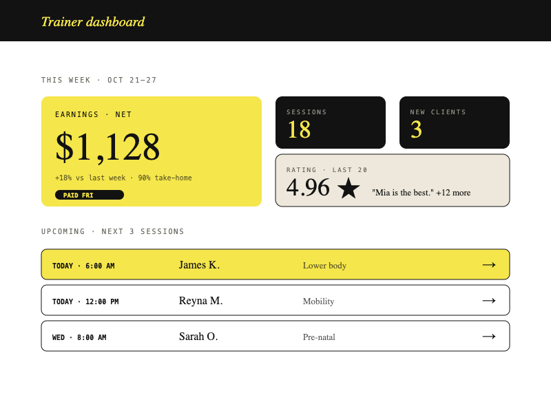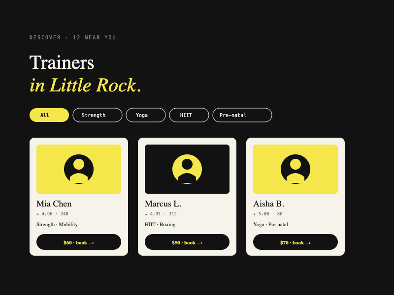 Qualified personal trainers have no good way to advertise their availability and specialty online. Clients who want personalized fitness help resort to Instagram DMs or expensive gym memberships. The market needed a purpose-built booking layer that worked for both sides of the equation.