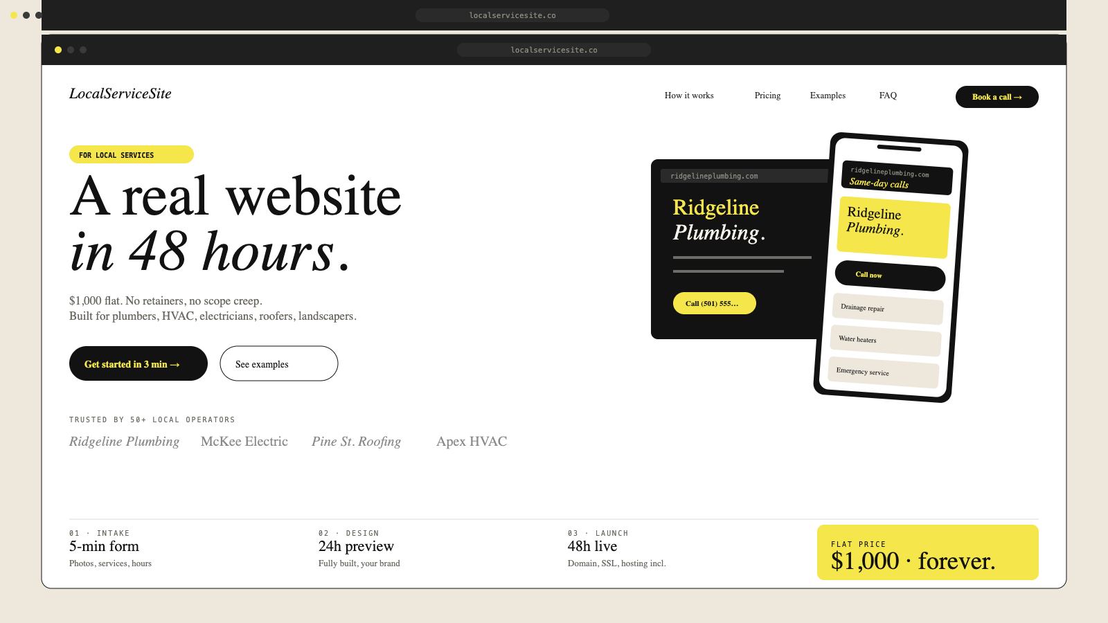 LocalServiceSite.co is a productized web design service. One flat price ($1,000), a 48-hour launch guarantee, and 7 days of unlimited revisions. Each site is fast, mobile-first, and fully owned by the client from day one. The model removes all the typical agency friction — no discovery calls, no proposals, no scope creep.