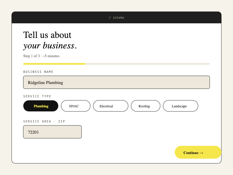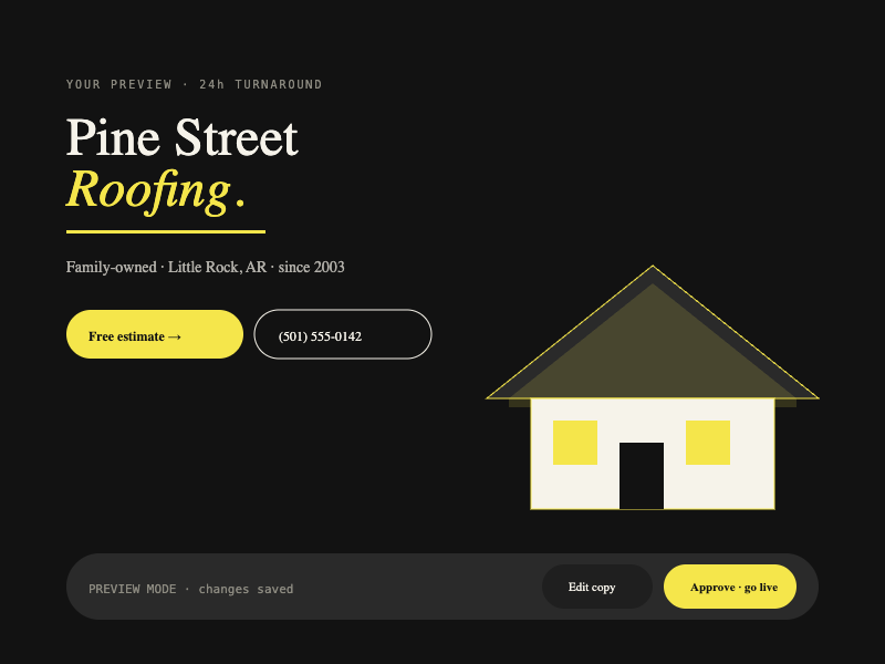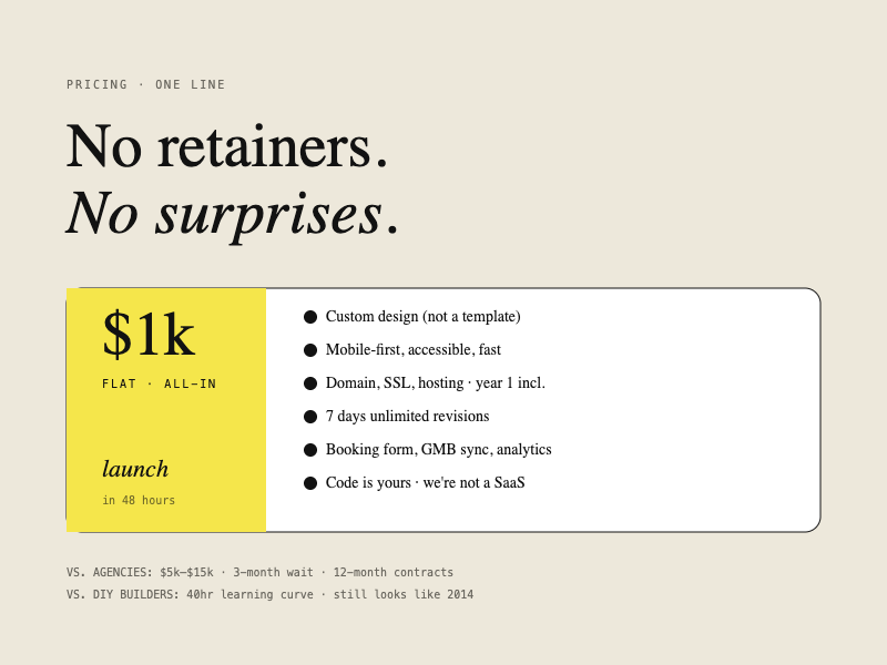Local service businesses — plumbers, HVAC techs, landscapers — need a web presence, but agencies charge $5k+ and take months. DIY builders produce something that looks DIY. The gap was a productized, fixed-price option with a real quality bar that operators could actually trust.