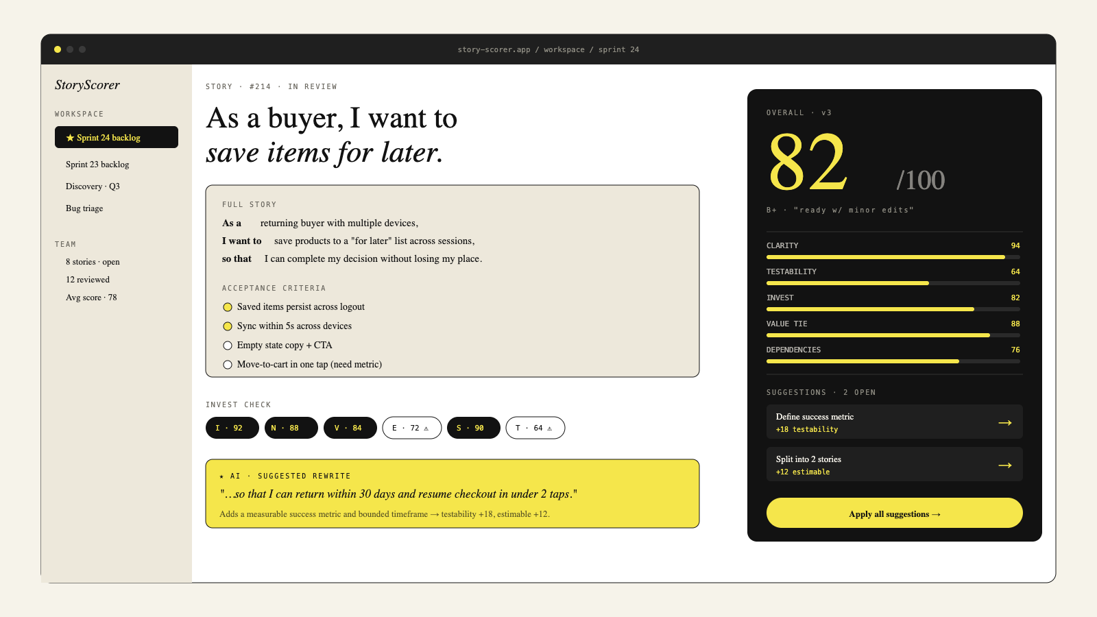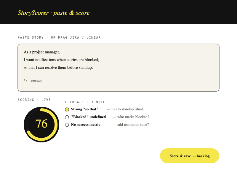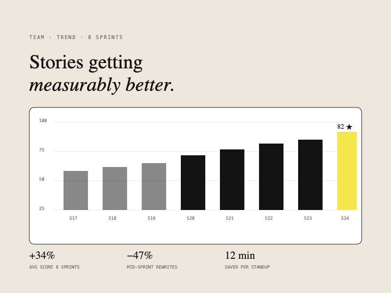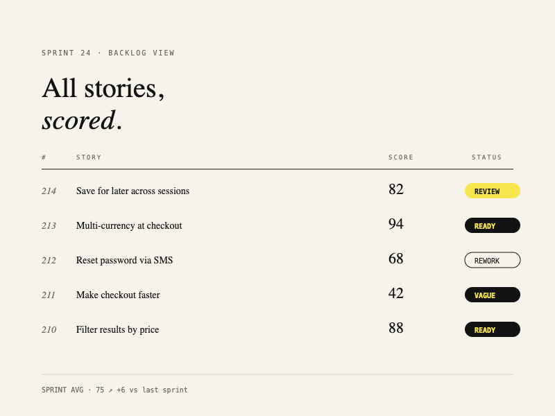 AI-powered quality scoring for user stories that actually ship.